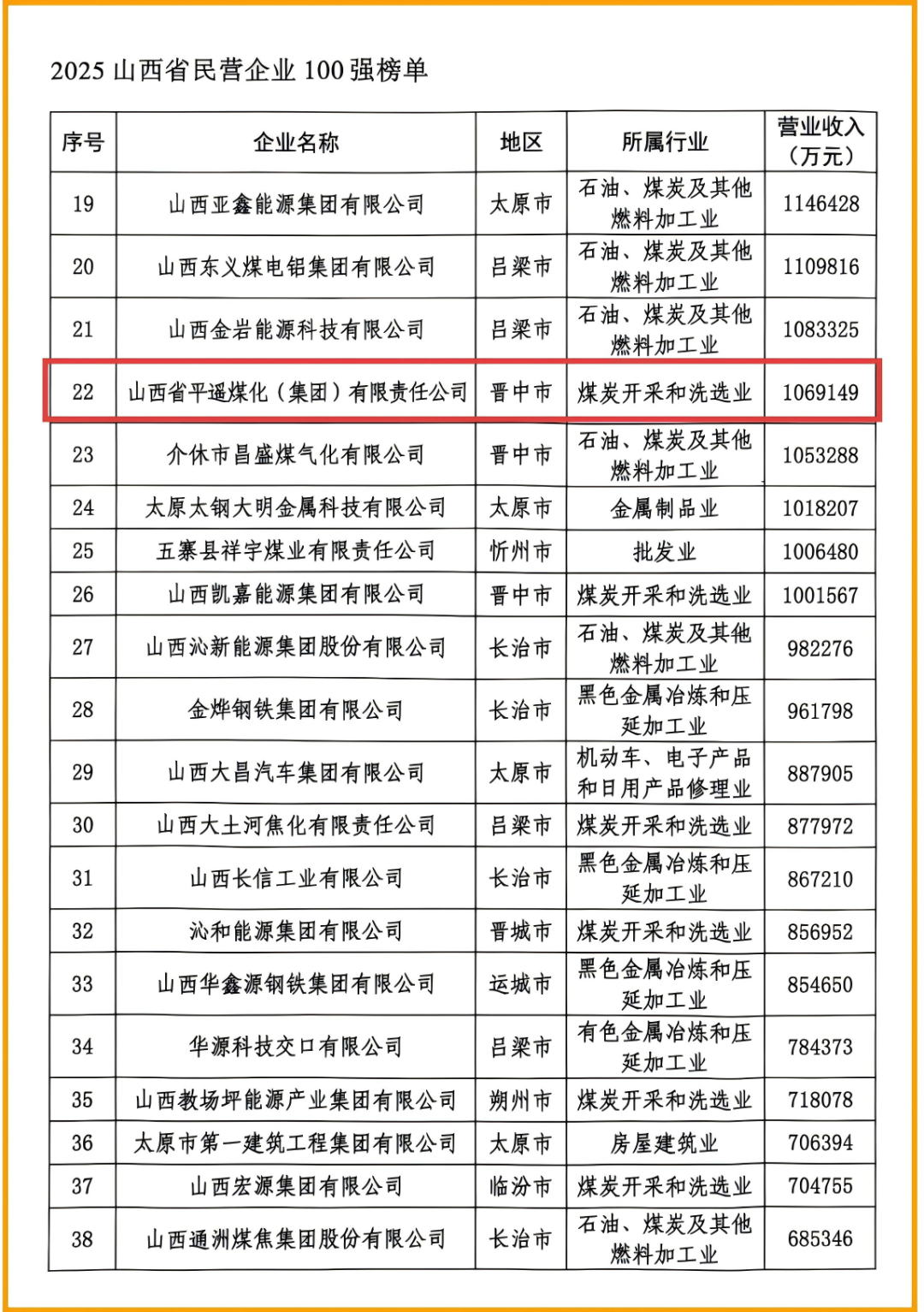 9月18日,山西省工商聯(lián)發(fā)布“2025山西省民營企業(yè)100強(qiáng)”榜單,平遙煤化集團(tuán)憑借雄厚的經(jīng)濟(jì)實(shí)力與強(qiáng)勁的發(fā)展勢頭再度登榜,位列第22位。
